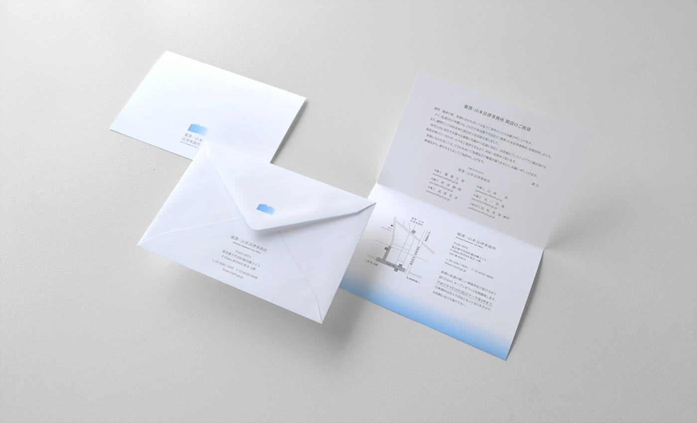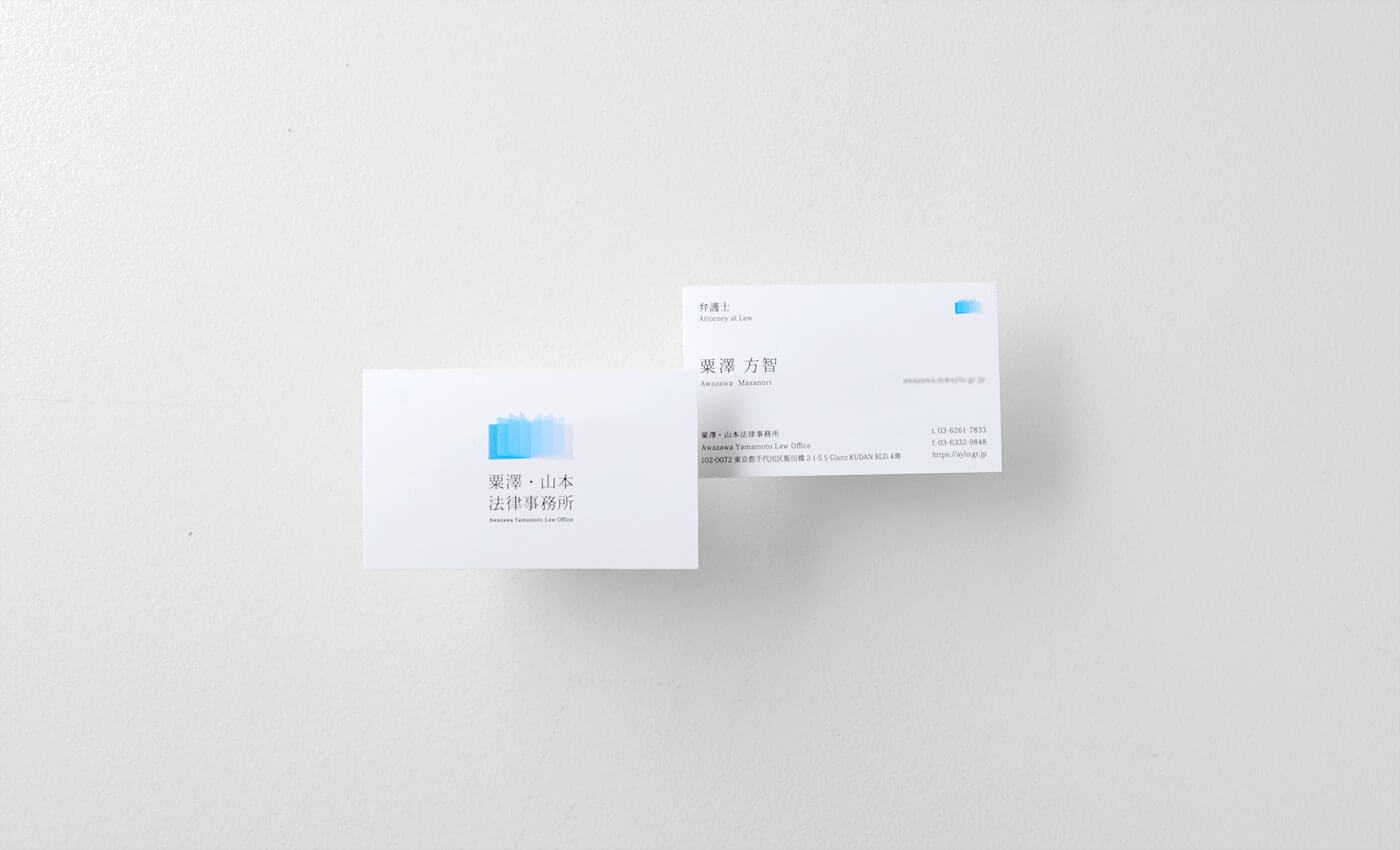 クライアントと一緒にチームとして議題解決し、質の高いリーガルサービスを提供する粟澤・山本法律事務所のVI を担当させていただきました。 様々な疑問や悩みを抱えるお客様とのやり取りから、解決するまでのプロセスを、本を読み解くことに例えて、“Clear Book” と称したマークを展開。気持ちが晴れていく様子をグラデーションで表し、人と人との触れ合いを大切にしたいとの思いを込めました。 VIでは、透過性のあるサインやホワイトスペースを活かした展開など、軽やかな気持ちがビジュアルをとおして伝わる素材選定やグラフィック表現を志向しました。