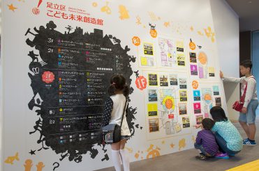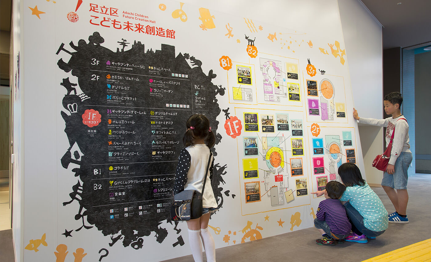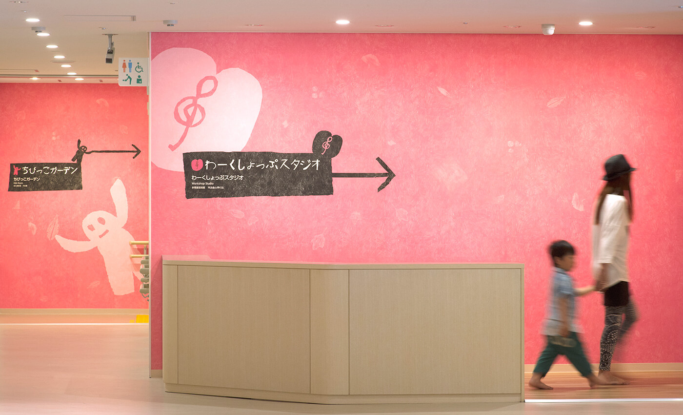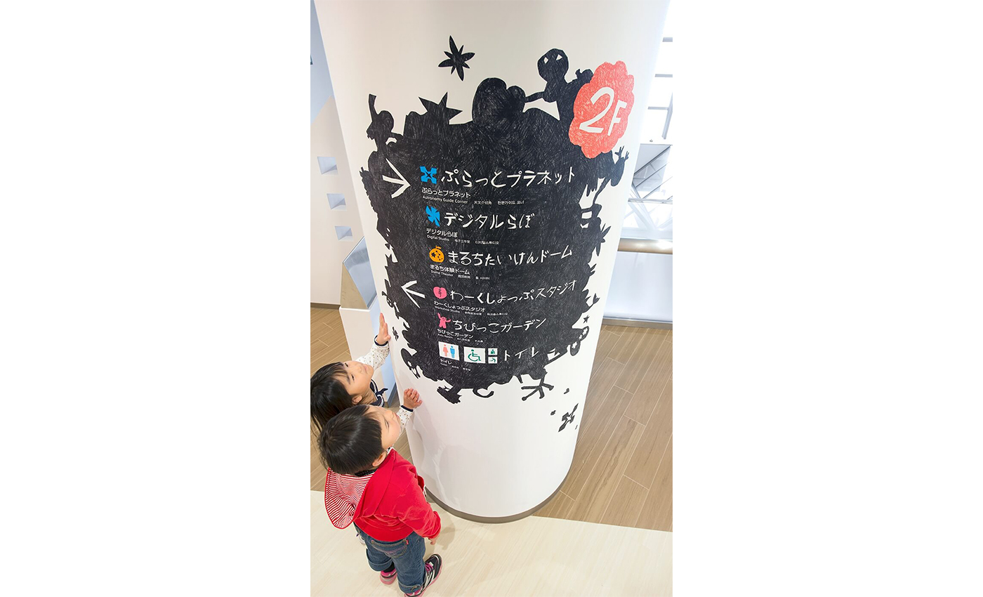 「こどもがつくる施設」というコンセプトに基づき、こどもの手によって生み出されたオリジナルフォントや個性あふれるエリアマークやイメージグラフィック等、シンボルマークやサイン計画に必要な要素のすべてが子どもによって生み出されました。また、カラーユニバーサルデザインを取入れ、多くの人が安心して利用できるよう配慮しました。