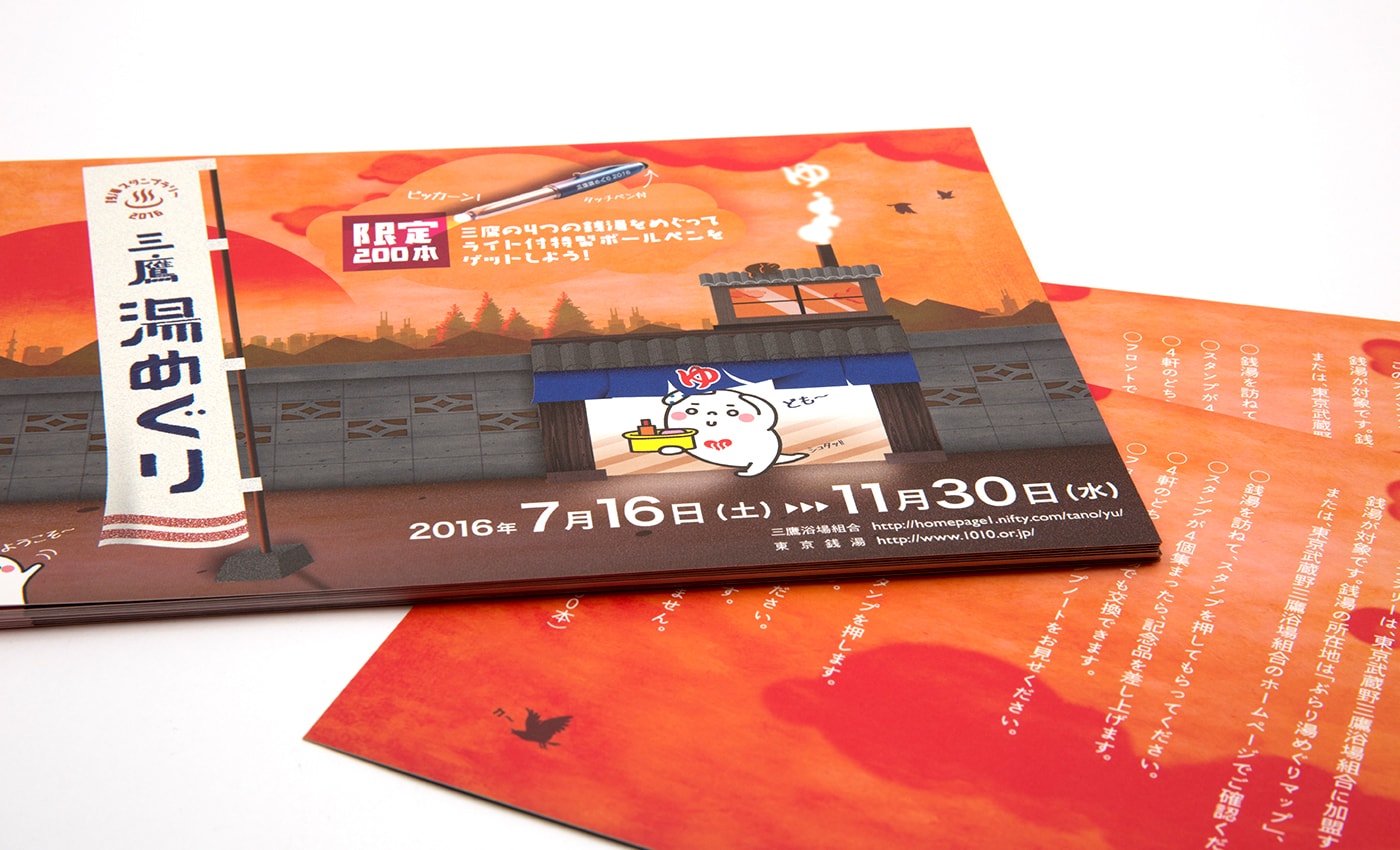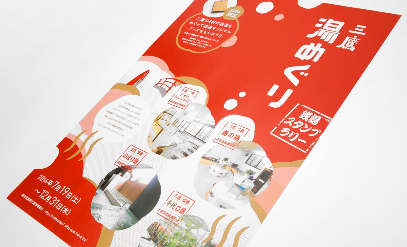 地域の人々が集まり、コミュニティが生まれる場所「銭湯」。近年、急速に銭湯が減りつつあるなか、銭湯文化を応援するイベント<銭湯スタンプラリー「三鷹湯めぐり」>。ロゴデザイン、ポスター・リーフレットデザイン、撮影を担当させて頂きました。 街にふれながら、三鷹市内の4 軒(アサヒトレンド21、春の湯、のぼり湯、千代乃湯>の銭湯をめぐります。普段、銭湯にあまり行かない方にも注目してもらえるように、毎年、デザインを変えて制作しています。