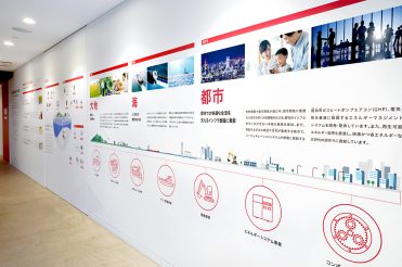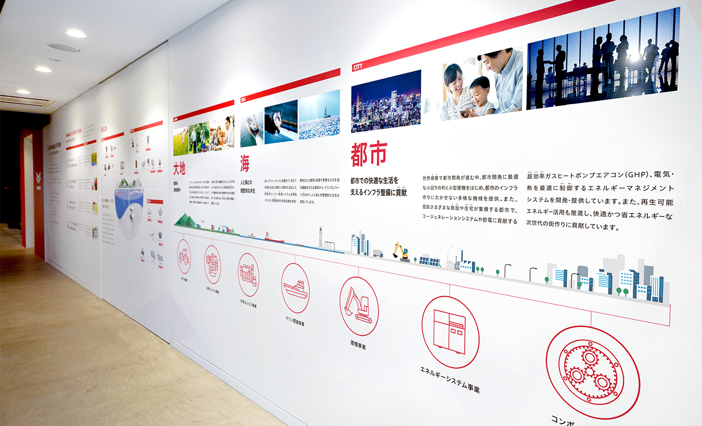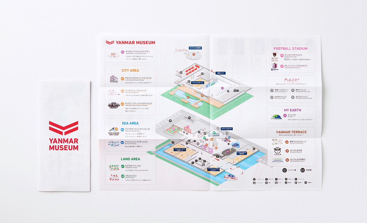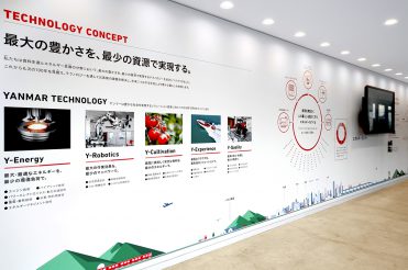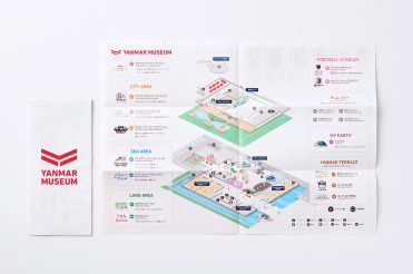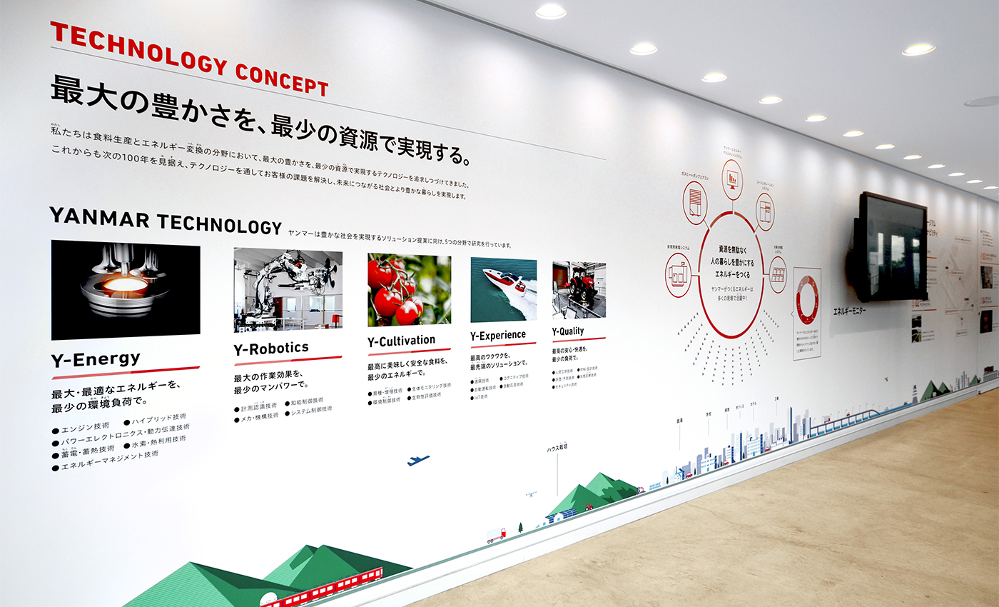 グラフィック全体にヤンマーのロゴからインスピレーションを受けた幾何学模様を散りばめ、一体感のあるデザインを展開。企業史の展示グラフィックでは雑誌の表紙をモチーフにインパクトのある構成で表現しました。またリーフレットや環境についての展示グラフィックでは、イラストや写真、アイコンを多用し、ヤンマー様の環境への取組みを分かりやすく表現しました。