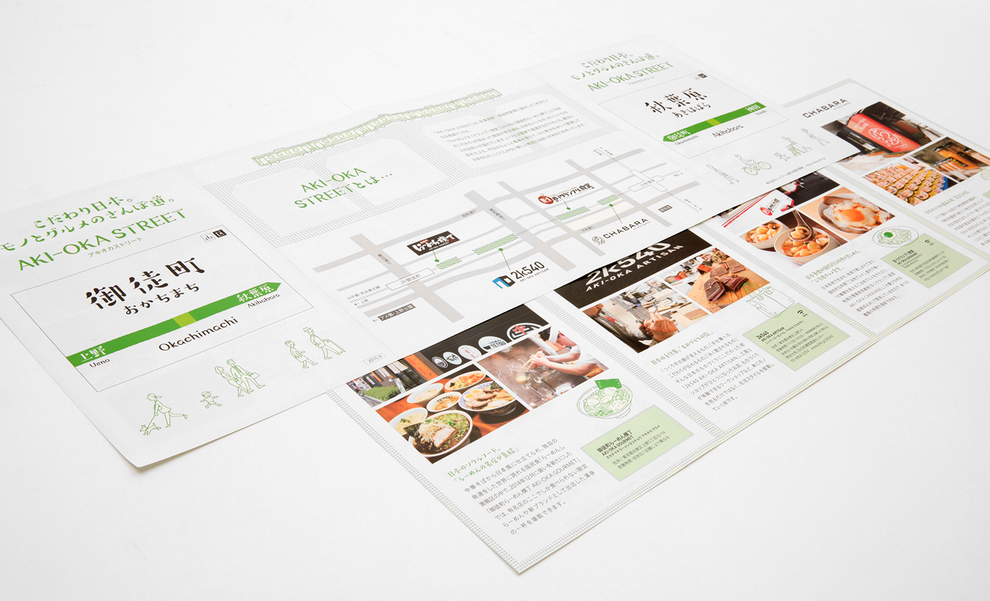 秋葉原駅-御徒町駅間に誕生した「歩きたくなる高架下」、AKI-OKA STREETの紹介リーフレットを制作させて頂きました。AKI-OKA STREETには、「ちゃばら」「B-1グランプリ食堂」「2k540」「御徒町らーめん横丁」と『日本のこだわり』が詰まった施設が軒を連ね、日本のいいもの、おいしいものとの出会いが溢れています。
