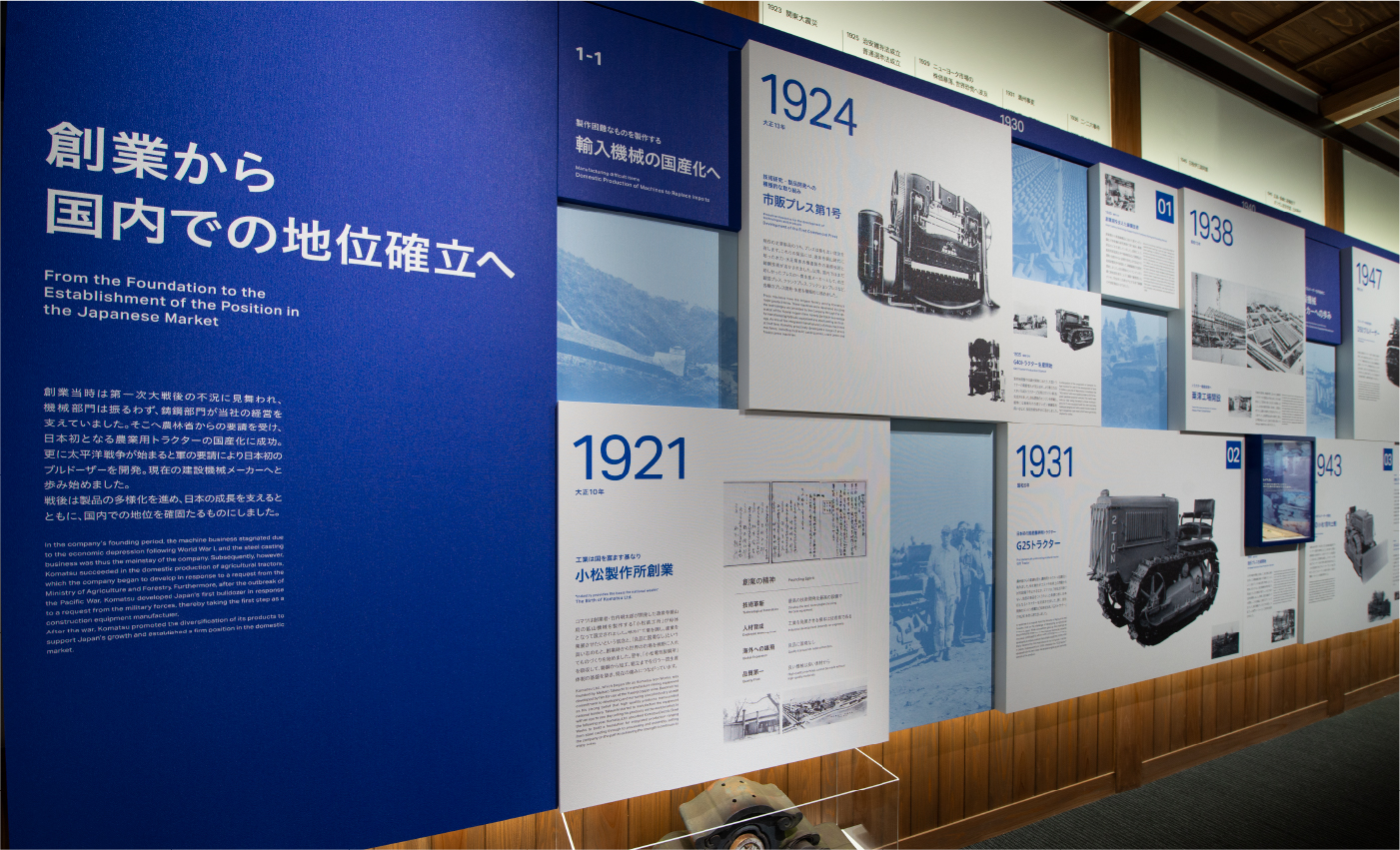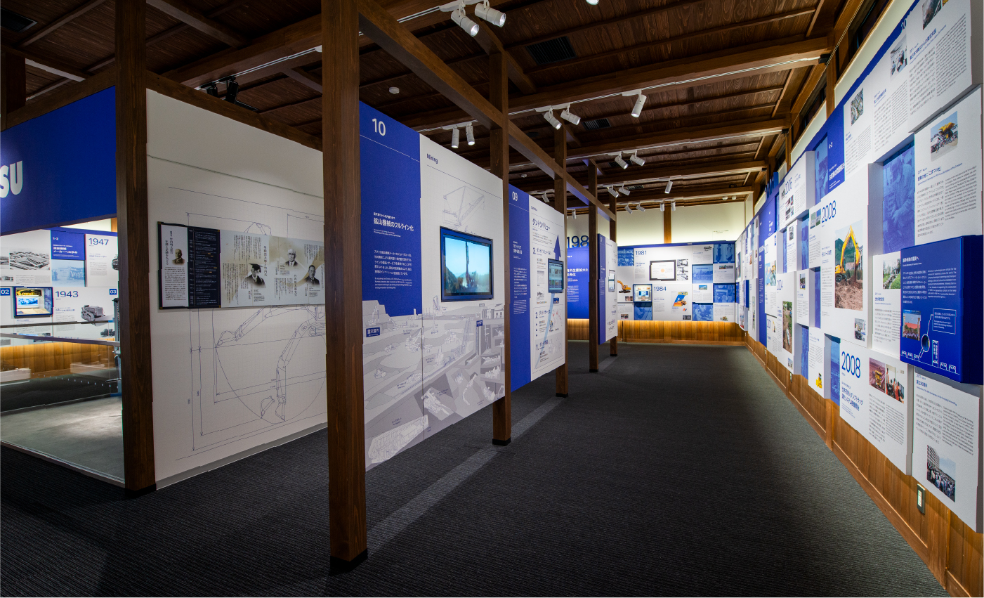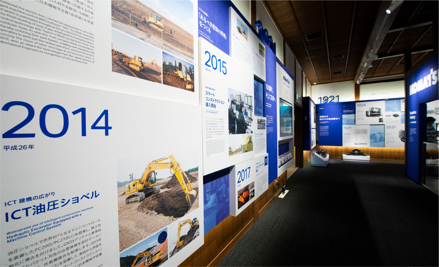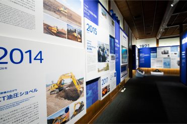 旧本社社屋の外観を復元した歴史館の展示室内は、コーポレートカラーであるグロリアブルーを配し、歴史と現在のブランドイメージが融和する空間デザインを目指しました。1Fでは項目毎のパネルを用いて創業からの歴史の積み重ねを表現し、2Fでは創業の精神である「Komatsu Way」を継承する意志を大きな帯状の展示構成で表しています。