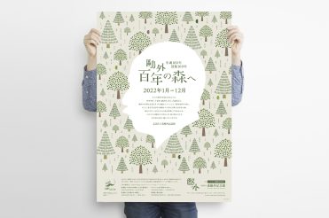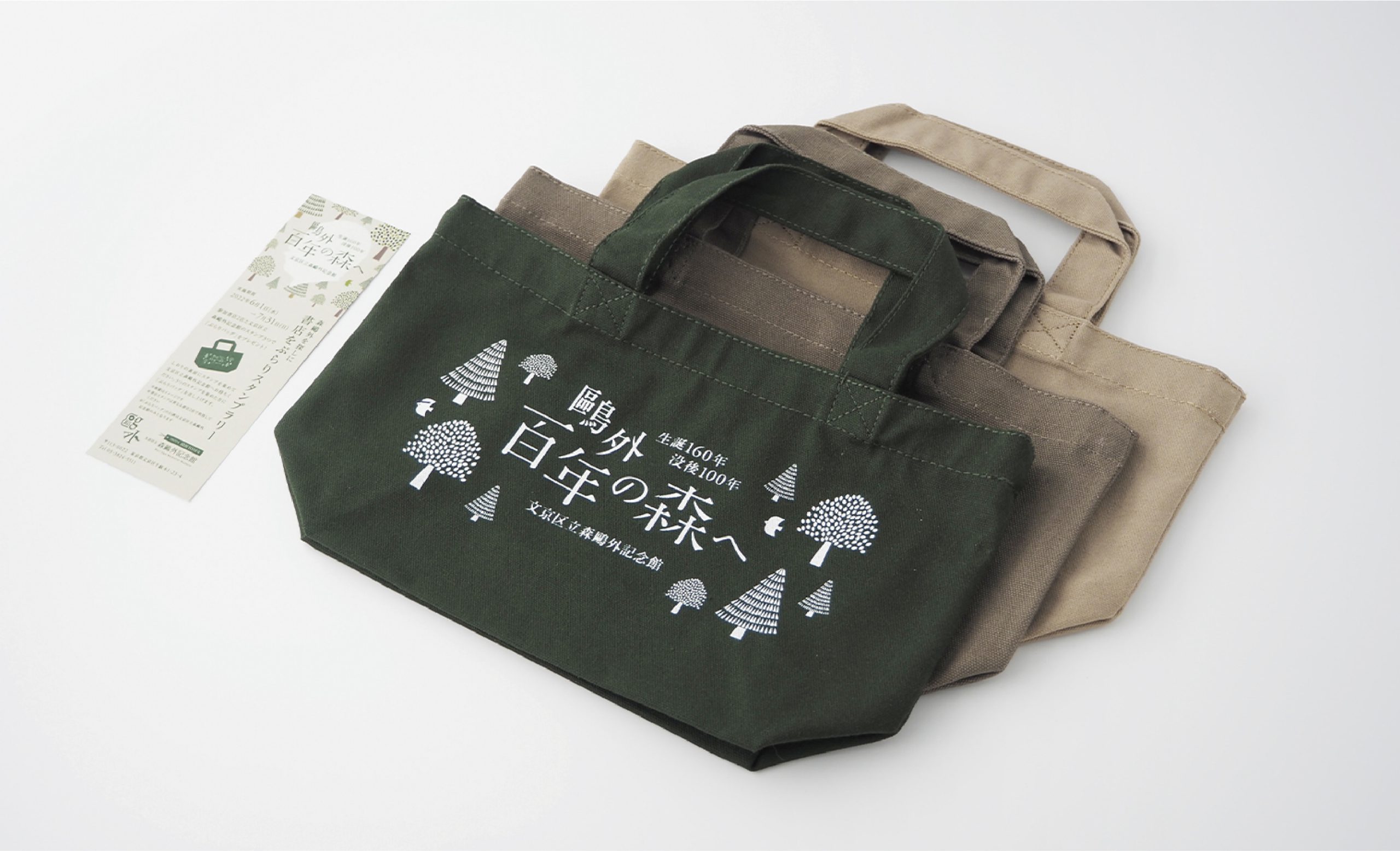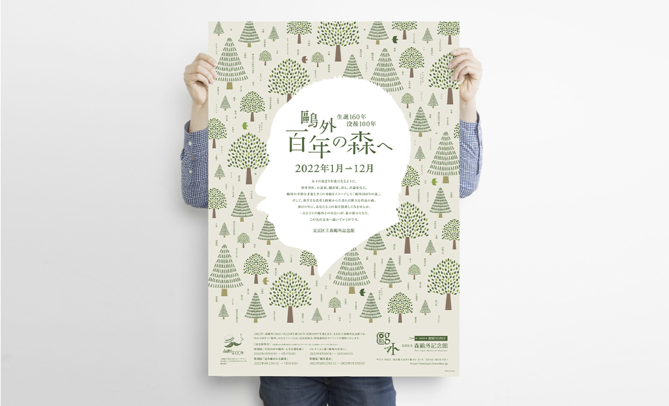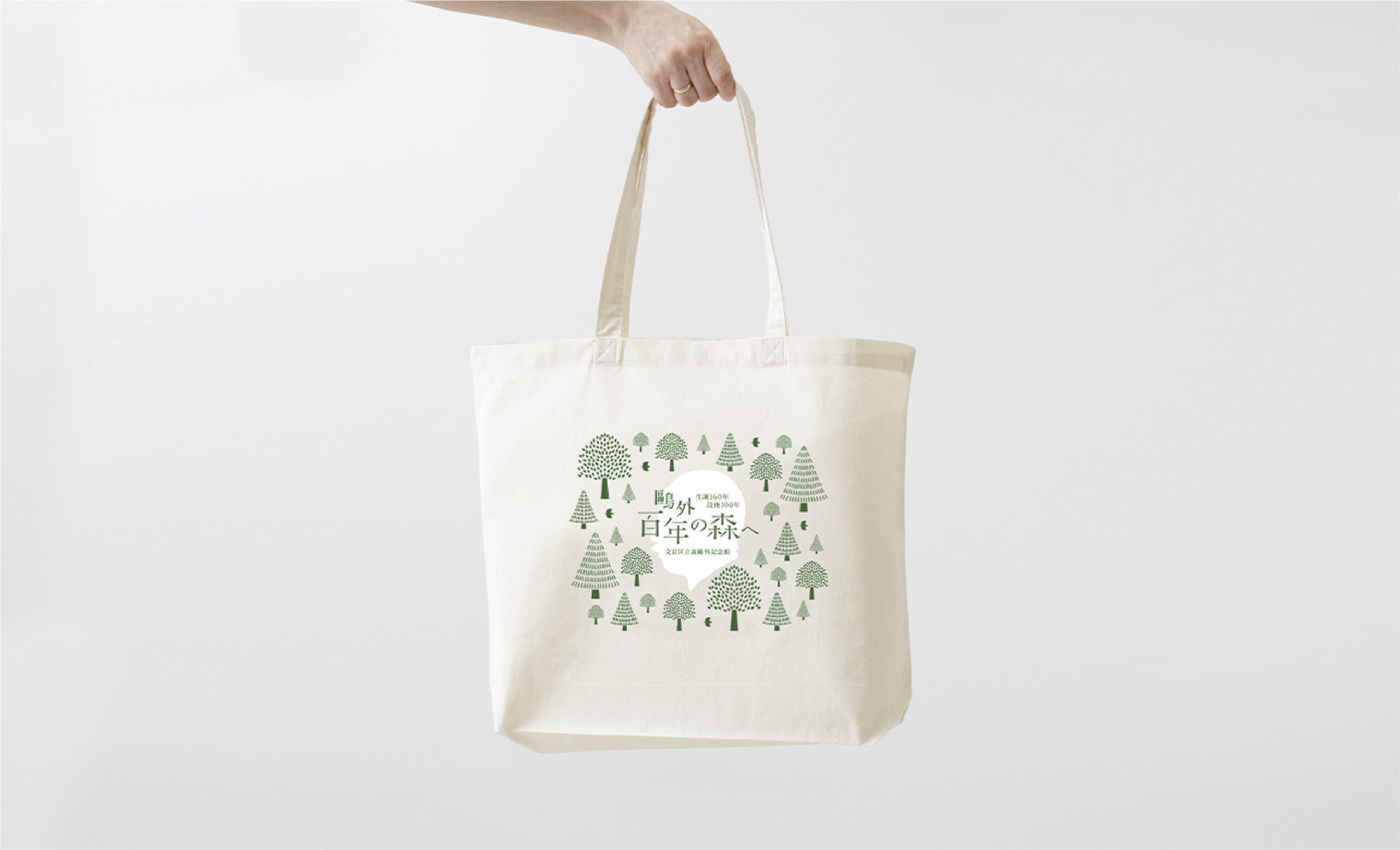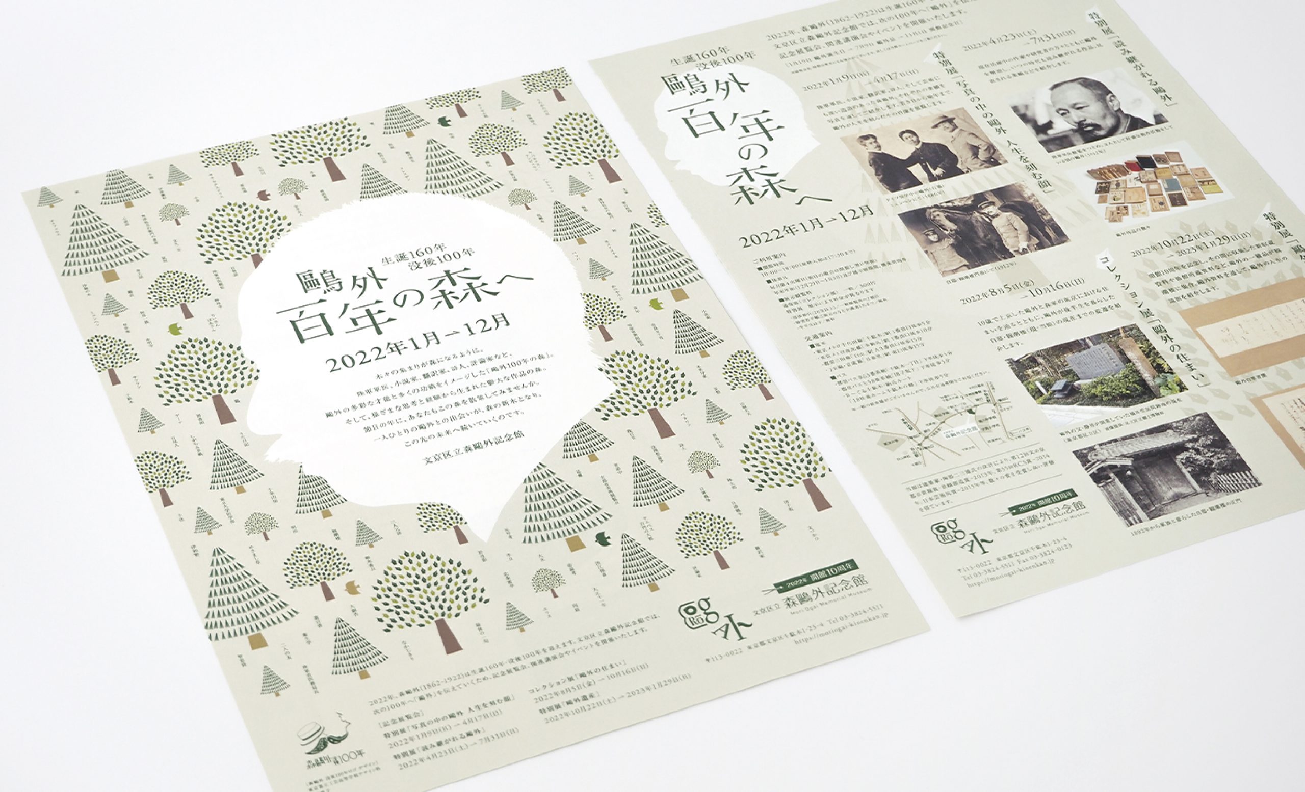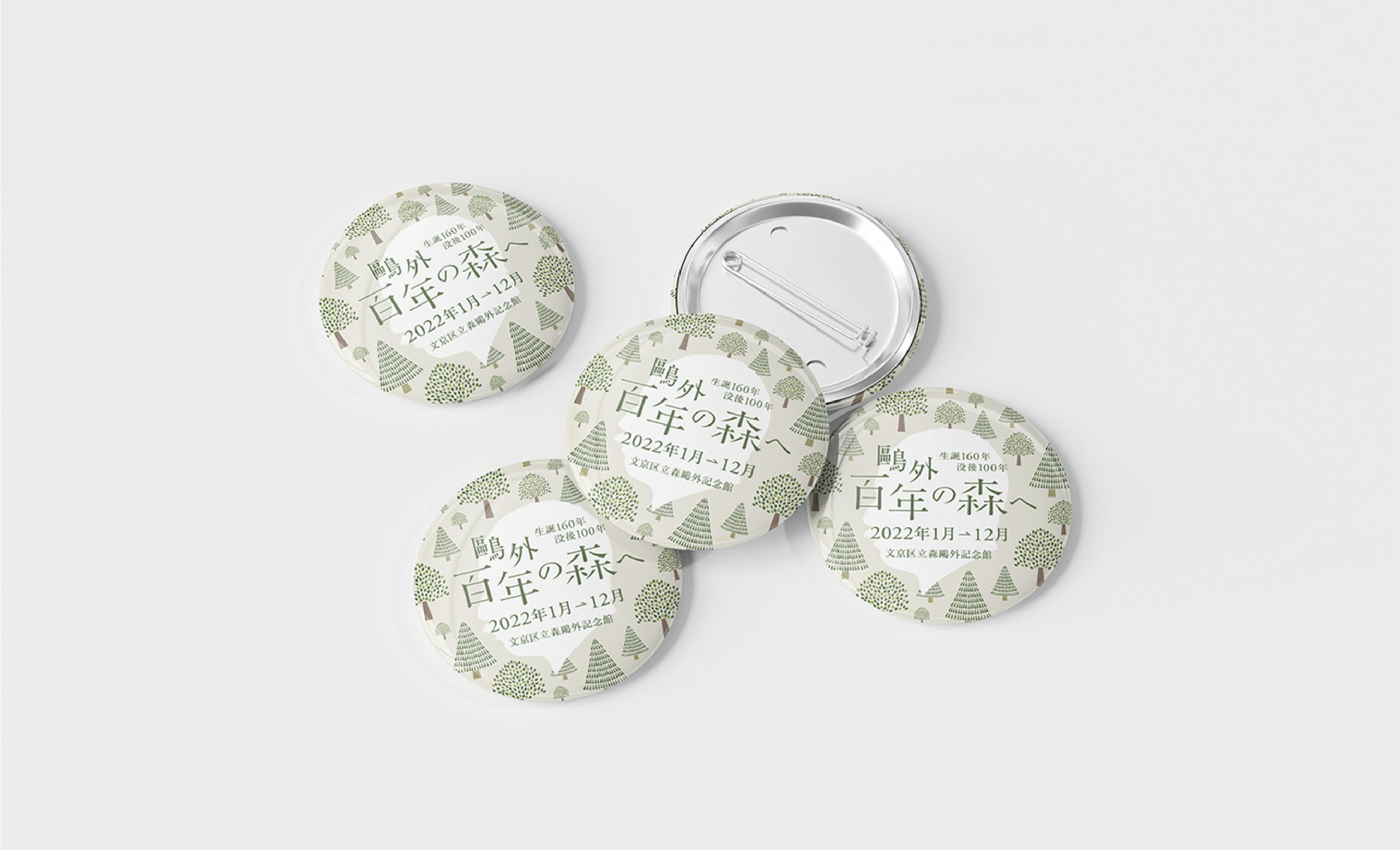 2022年、森鴎外は没後100年を迎えます。また、森鷗外記念館は開館10周年となります。 この記念の年に、ロゴ、キービジュアルをはじめ、ポスター、フライヤー、トートバッグ、缶バッジなどのノベルティのデザインを担当させていただきました。没後100年と鴎外の膨大な作品と功績を「森」になぞらえて、これまで知らなかった人々にも鴎外の魅力を伝えるため、鴎外の横顔とペン先と本で構成された木々を柔らかなグリーンの色彩でまとめ、ナチュラルで親しみやすいビジュアルにより展開しました。