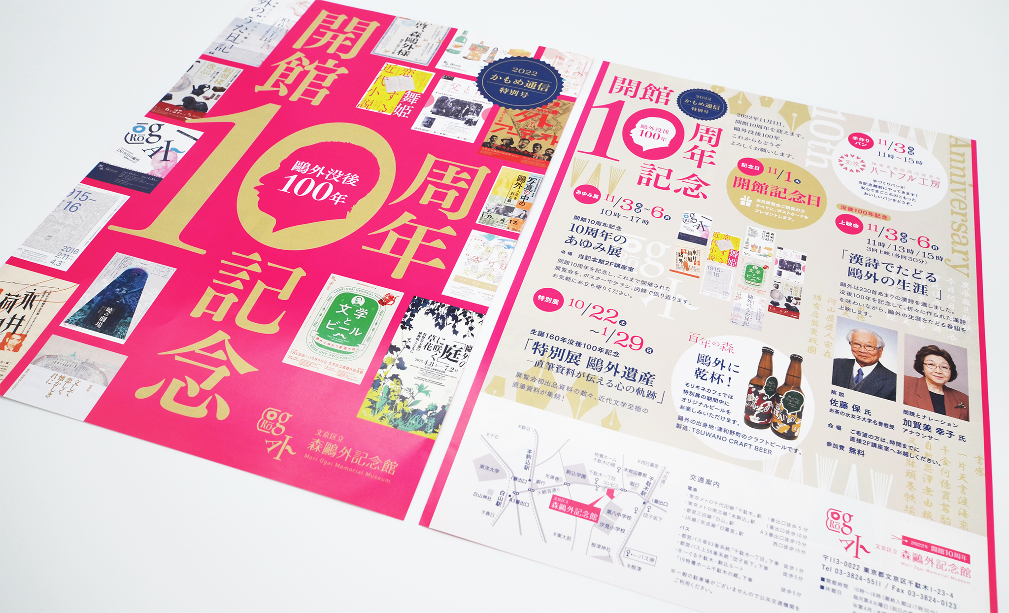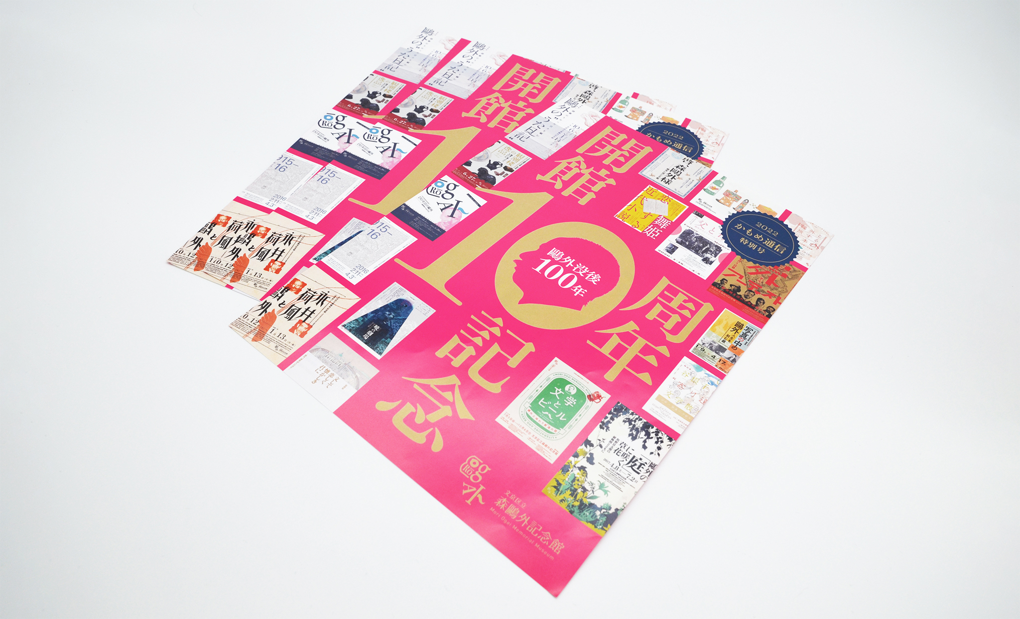 10周年記念をお祝いするため「10」が際立つように森鴎外の横顔を組み合わせ、ヴィヴィッドピンクとゴールドで全体を配色し、過去のポスターを背景に華やかに表現しました。