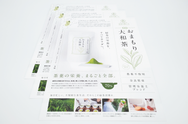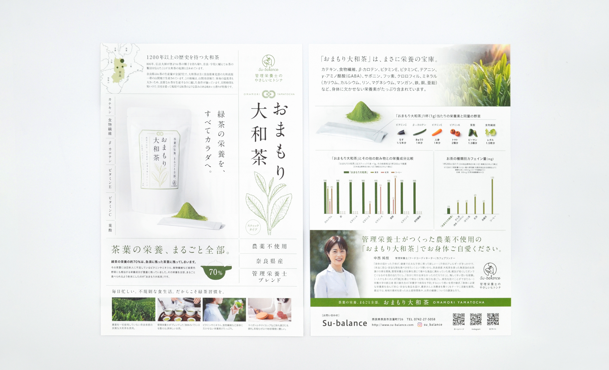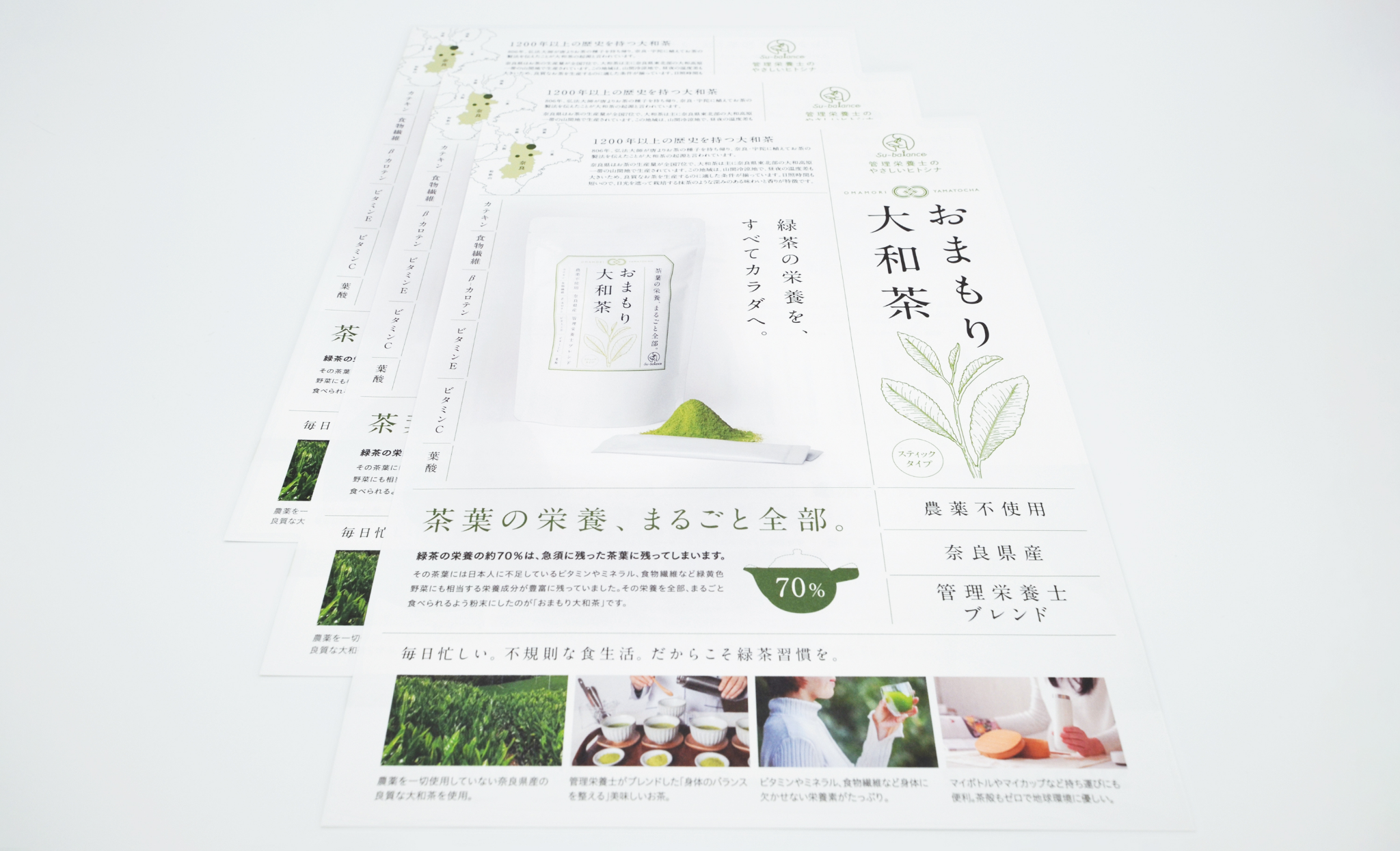 奈良県産の大和茶をブレンドしたスティック粉末緑茶「おまもり大和茶」のパッケージ、リーフレットデザインを担当させていただきました。
