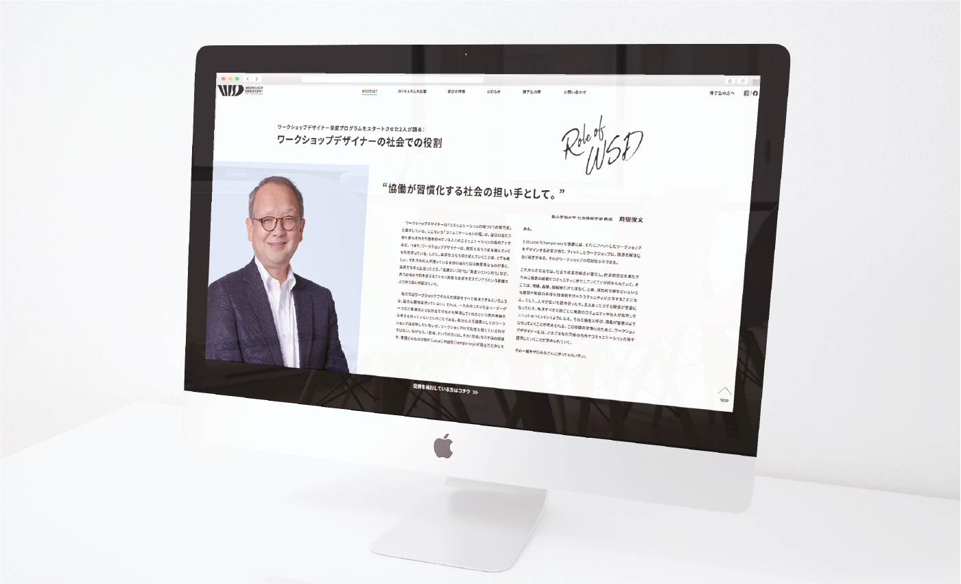 「コミュニケーションの場づくりの専門家」を育成しているWSD育成プログラム様のウェブサイトを制作させていただきました。会社組織、医療、福祉、教育現場、地域コミュニティ、アートなど、様々なコミュニケーションを必要とする現場でその専門性が求められているワークショップデザイナー(WSD)。WSDのイメージを「学び」「繋がり」「広がる」というキーワードをモチーフに動的で多彩なグラフィックで展開し、WSDに関わる人々の持つエネルギーとワクワク感をデザインしました。